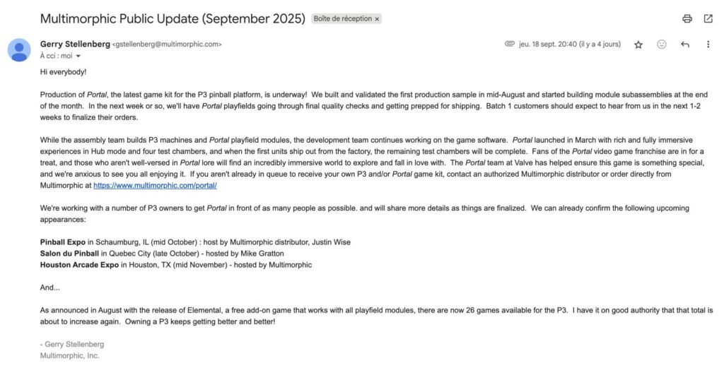 On bascule chez Multimorphic avec Gerry qui a annoncé la mise en assemblage du module Portal, inspiré du jeu éponyme, lors de sa communication de septembre, le jeu sera visible et jouable durant les 3 prochains salons en amérique du nord : Pinball Expo à Chicago, Salon du Pinball au Québec et le Houston Arcade Expo.