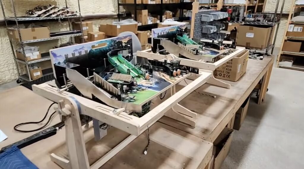 • La vidéo montre le processus d’assemblage : installation des playfields, câblage, tests qualité et préparation pour emballage/expédition.