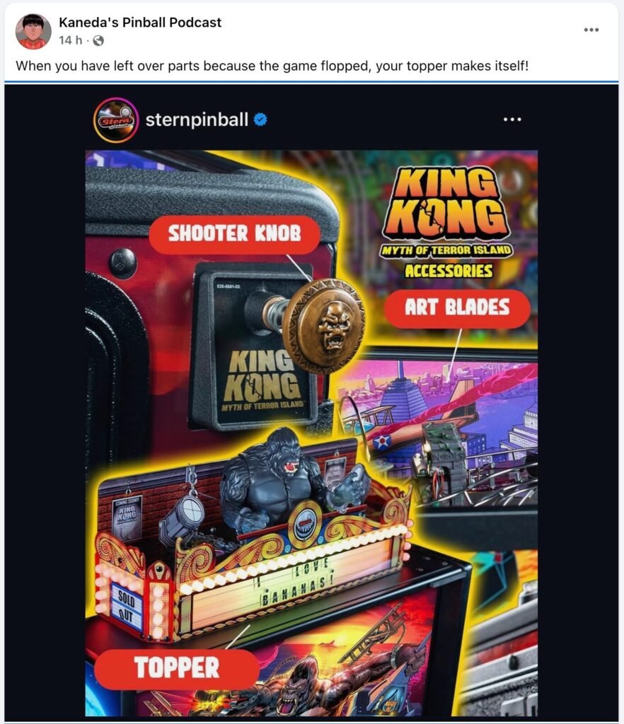 On commence avec Stern Pinball qui a dévoilé la gamme officielle d’accessoires pour son flipper Kind Kong Myth of Terror Island. Les accessoires incluent un topper avec un King Kong animatronique, 75 lumières RVB et des illustrations dessinées à la main par Greg Freres, des art blades, un shooter rod et des side armors.