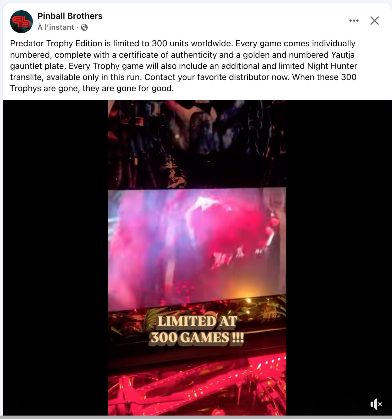 Pinball Brothers continue de promouvoir son Predator… en expliquant que c’est une version limitée à 300 exemplaires dans le monde… mais qui apparamment n’est toujours pas « sold out » !