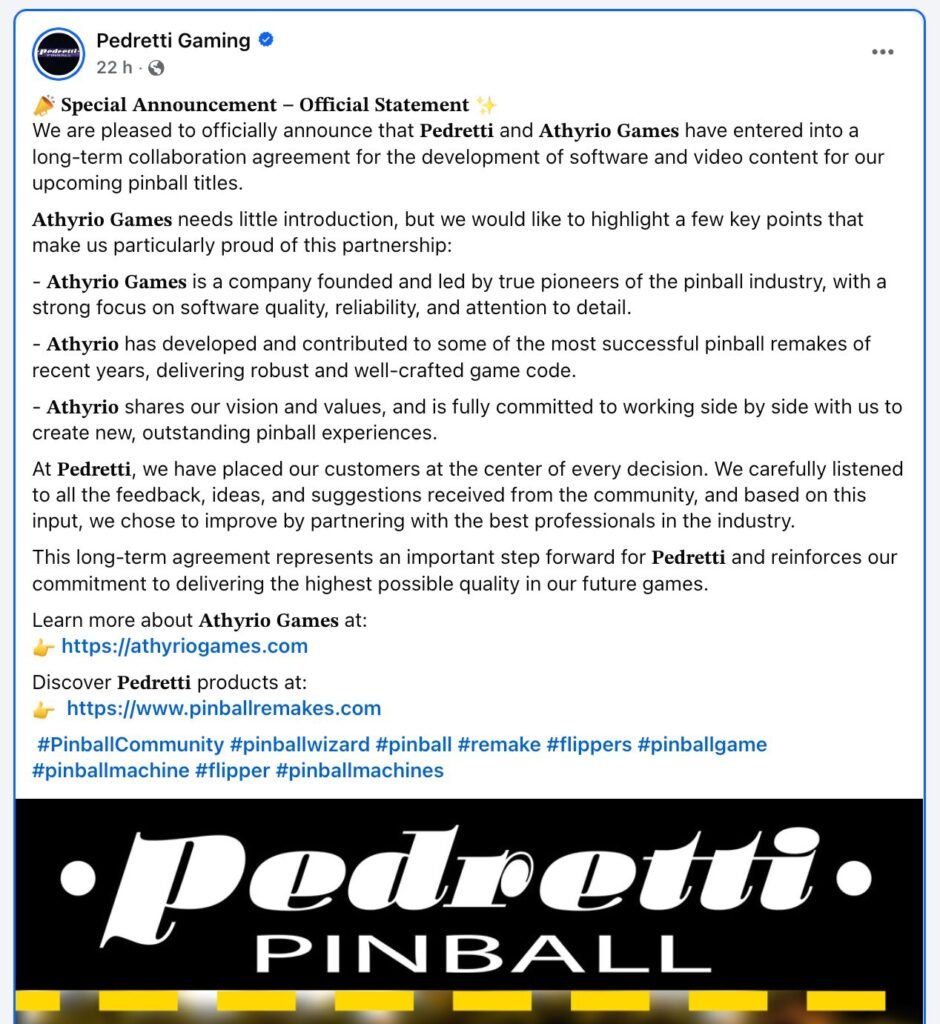 Dans les news de ces derniers jours, on a pu voir une très intéressante annonce de Pedretti qui a annoncé une grande nouvelle concernant les prochains remakes de flippers Bally Williams : Pedretti Gaming a signé un contrat pluriannuel avec la société de développement logiciel Athyrio Games pour la création de logiciels et de contenus vidéo destinés aux futurs flippers.
