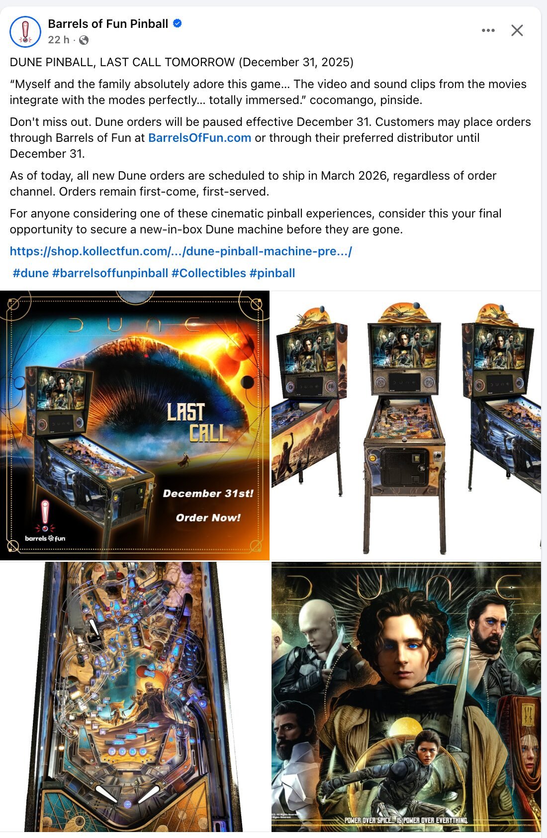 Barrels of Fun a relancé les acheteurs potentiels de Dune, en annonçant que les dernières commandes pour Dune devraient être passées avant le 31 décembre 2025.