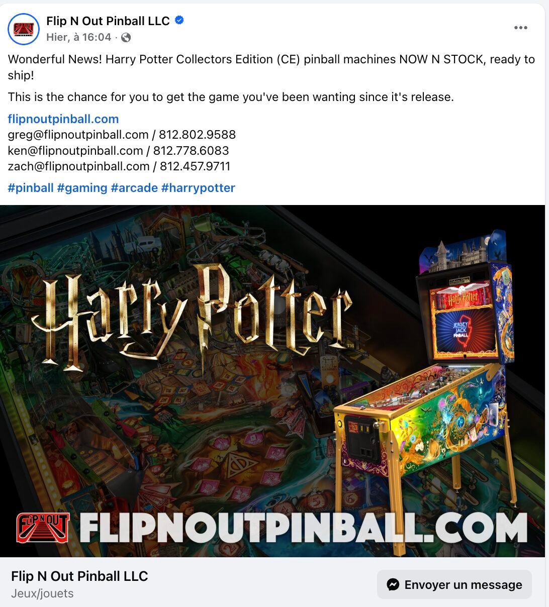 Pour parler un peu de Jersey Jack Pinball, il semblerait que les stocks de Harry Potter se constituent aux USA, les distribtuteurs ne sont plus en flux tendus sur les machines Collectors qui sont immédiatement disponibles.
