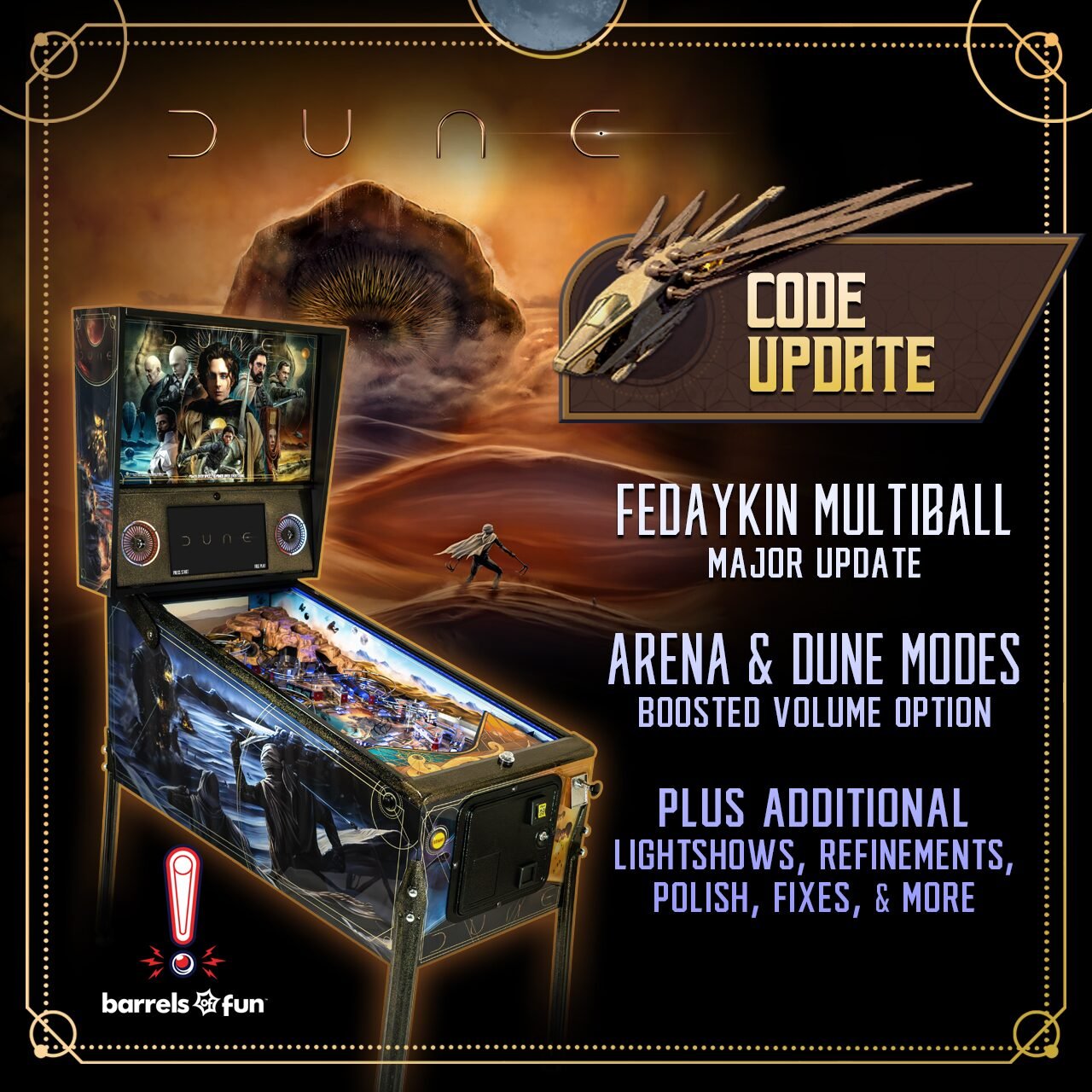 Barrels of Fun a publié sa sixième mise à jour de code pour Dune, qui introduit une mise à jour du « Fedaykin Multiball » et de nombreux ajustements.