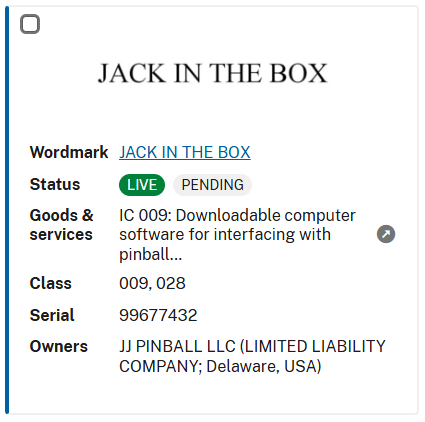 Cela fait quelques temps que l’on a pas d’actu du côté de Jersey Jack Pinball (en attendant l’arrivée du prochain flip – Sonic), et on a appris cette semaine que JJP a déposé une nouvelle marque : « Jack In The Box ».