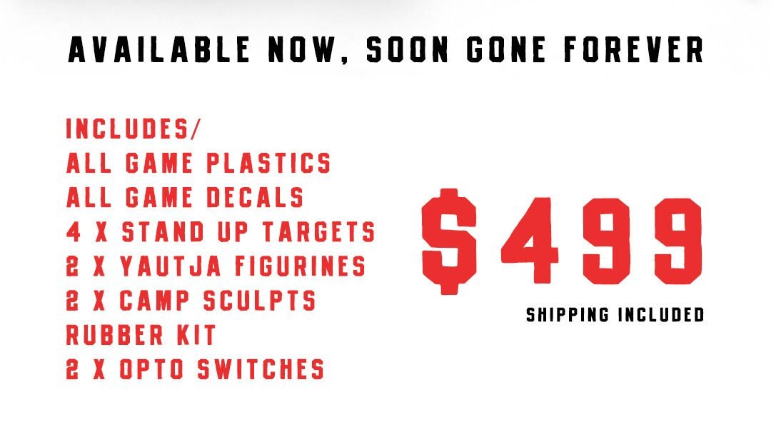 Les personnes qui s’inquiètent d’obtenir des pièces de rechange à l’avenir peuvent même acheter un nouveau « Kit de survie » de Pinball Brothers pour le jeu. Le kit comprend un ensemble complet de plastiques et de décalcomanies du jeu, 4 cibles, 2 figurines Tautja, 2 Camp Sculpts, un kit de rubbers et 2 commutateurs opto pour 499 $.